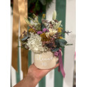 Su base de cerámica en tono crema alberga una composición artesanal de flores preservadas y secas cuidadosamente seleccionadas, entre las que pueden encontrarse hortensias, lagurus, limonium, flores de paja, eucalipto y otras flores silvestres según disponibilidad. El resultado es una pieza llena de textura, color y vida que no necesita agua ni cuidados especiales.